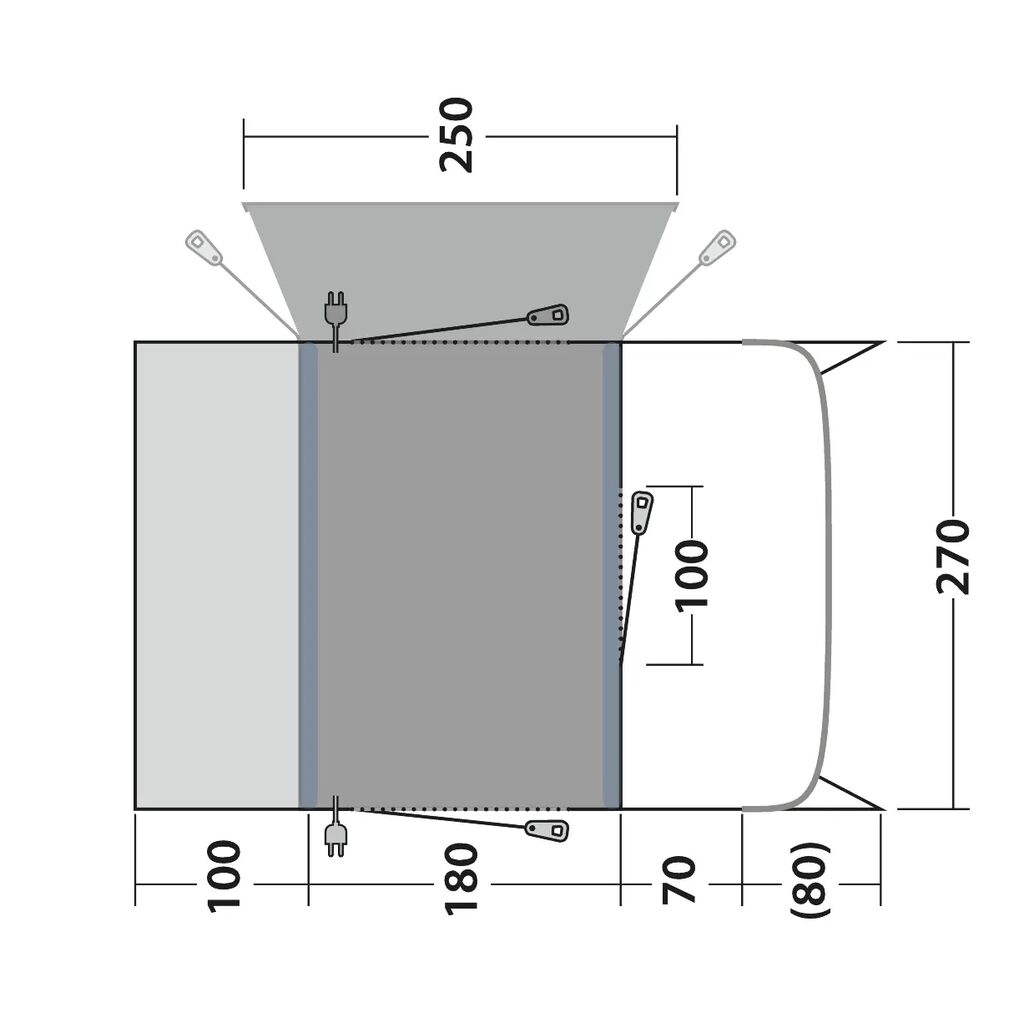 Outwell Talladega er et fritstående drive-away fortelt, der bruger luftkanaler i stedet for traditionelle teltstænger, hvilket gør opsætningen hurtig og nem. En smart løsning er, at teltet monteres langs bilen i stedet for lige ud, hvilket kræver mindre bredde på campingpladsen – perfekt på smallere pladser. Teltet kan også anvendes uden sluse og fungerer da som et rummeligt familietelt (vi anbefaler at tilkøbe sovekabine for optimal komfort). Da teltet er helt fritstående, kan det blive stående på campingpladsen, mens I tager bilen på tur. Slusen passer til køretøjer med en højde mellem 175 og 200 cm.