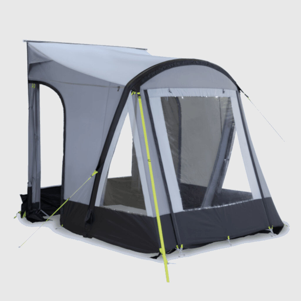 Dometic Leggera Air er et let og fleksibelt luftfortelt med luftkanaler. Teltet er ekstremt nemt at opstille og kan takket være dobbelt kederlister monteres på både campingvogn og autocamper. Fastgør blot teltdugen i skinnen på campingvognen eller autocamperens markise, sæt fire pløkker i hjørnerne og pump de integrerede luftkanaler op fra en enkelt ventil. Fastgør derefter tætningen mod campingvognen, og teltet er klar til brug. En stor frontvinduespanel giver et behageligt lys inde i teltet.