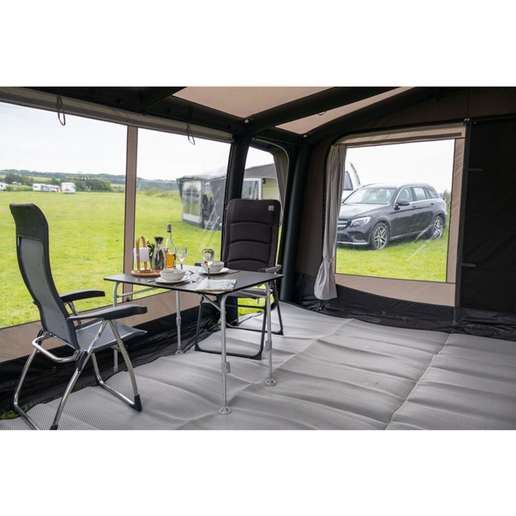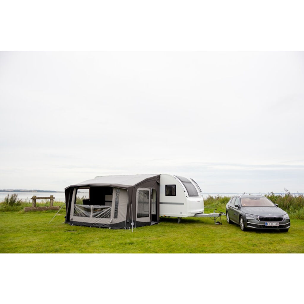 Telta Scenic 390 er et rummeligt og behageligt fortelt med en dybde på 300 cm og store åbningsbare vinduespaneler. De store vinduer foran på teltet giver både et behageligt lys og en følelse af rummelighed i teltet. Hvis man vil reducere indsigt, kan gardinerne trækkes for. Teltet er hurtigt at opsætte, og dets kraftige, åndbare dug reducerer kondens og giver et køligere klima på varme dage. Perfekt til dem, der camperer ofte eller rejser sydpå om sommeren. Teltet er let at montere og kan, takket være dobbelte kederlister, installeres på både campingvogne og autocampere. Fastgør blot teltdugen til campingvognens skinne eller skinnen på autocamperens markise, sæt fire pløkker i hjørnerne og pump de integrerede kanaler i teltdugen op, der danner rammen fra en ventil på teltet. Fastgør derefter tætningen mod campingvognen, og teltet er klar til indflytning.