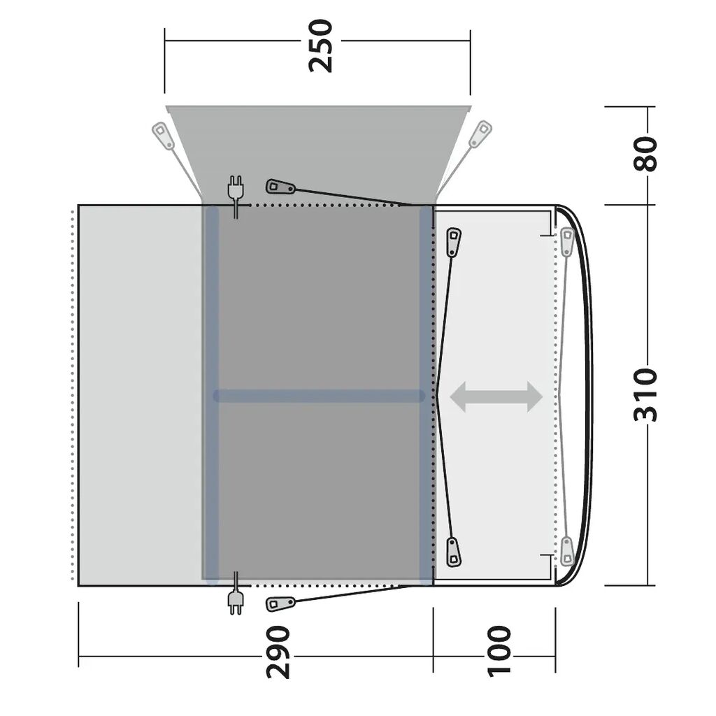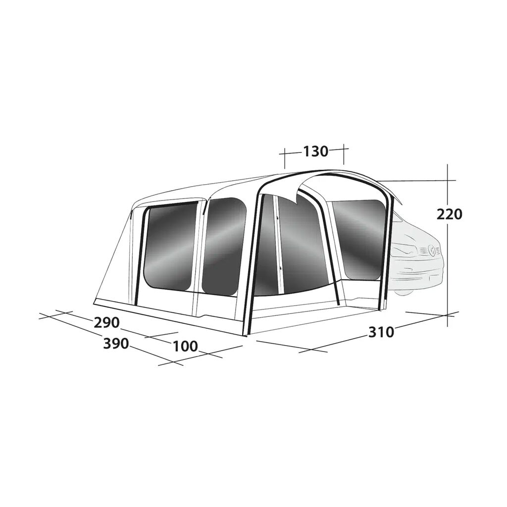 Jonesville 290SA Flex giver høj komfort og masser af plads. Fordi det placeres langs bilen, er teltet 390 cm langt – perfekt til hygge, selv med sovekabine installeret. Bøjede luftkanaler giver god lofthøjde. Der er adgang via den store frontdør, sidedøren eller de små døre på siderne af slusen. På varme dage kan hele fronten åbnes og danne et overdækket opholdsområde. Myggenet i dørene holder småkryb ude. Fast bund beskytter mod fugt og træk og mindsker kondens.