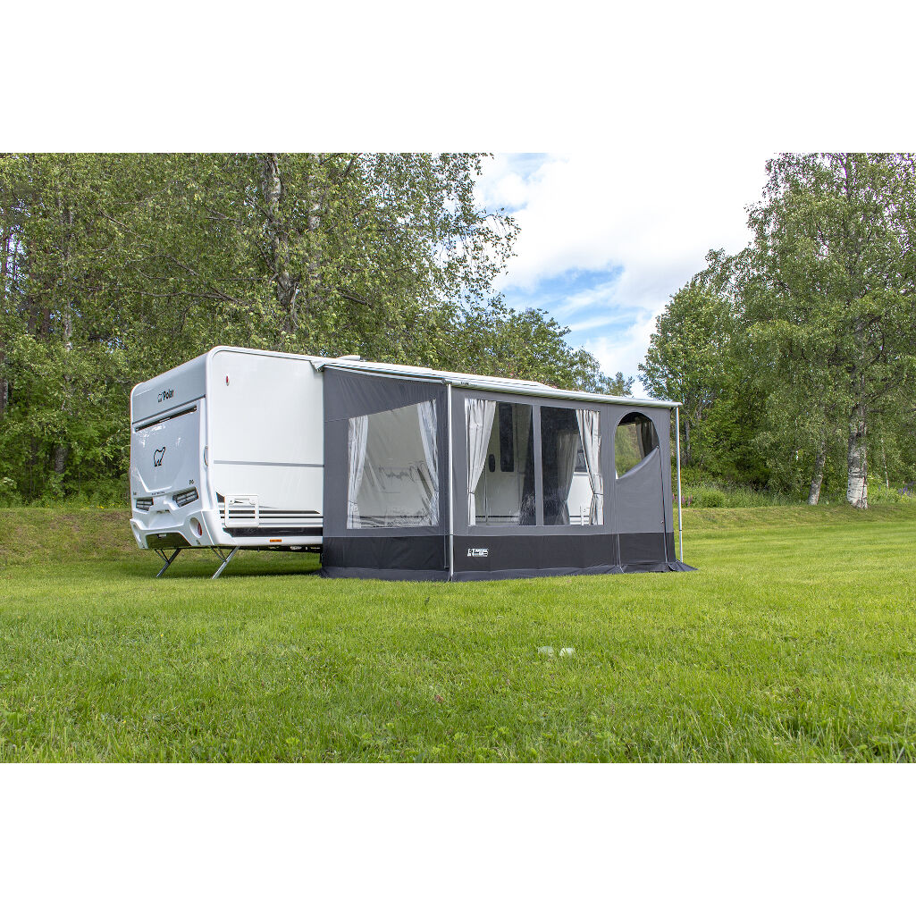 Lav nemt din posmarkise om til et fortelt, når vejret kræver det. Et sæt med sider og front, der monteres på posmarkisen. Svenska Tälts slidstærke akryldug er både meget holdbar og har en lang levetid. Store vinduer med gardiner skaber et lyst og behageligt rum. En dør i fronten gør teltet og campingvognen let tilgængelig. Let at montere.
