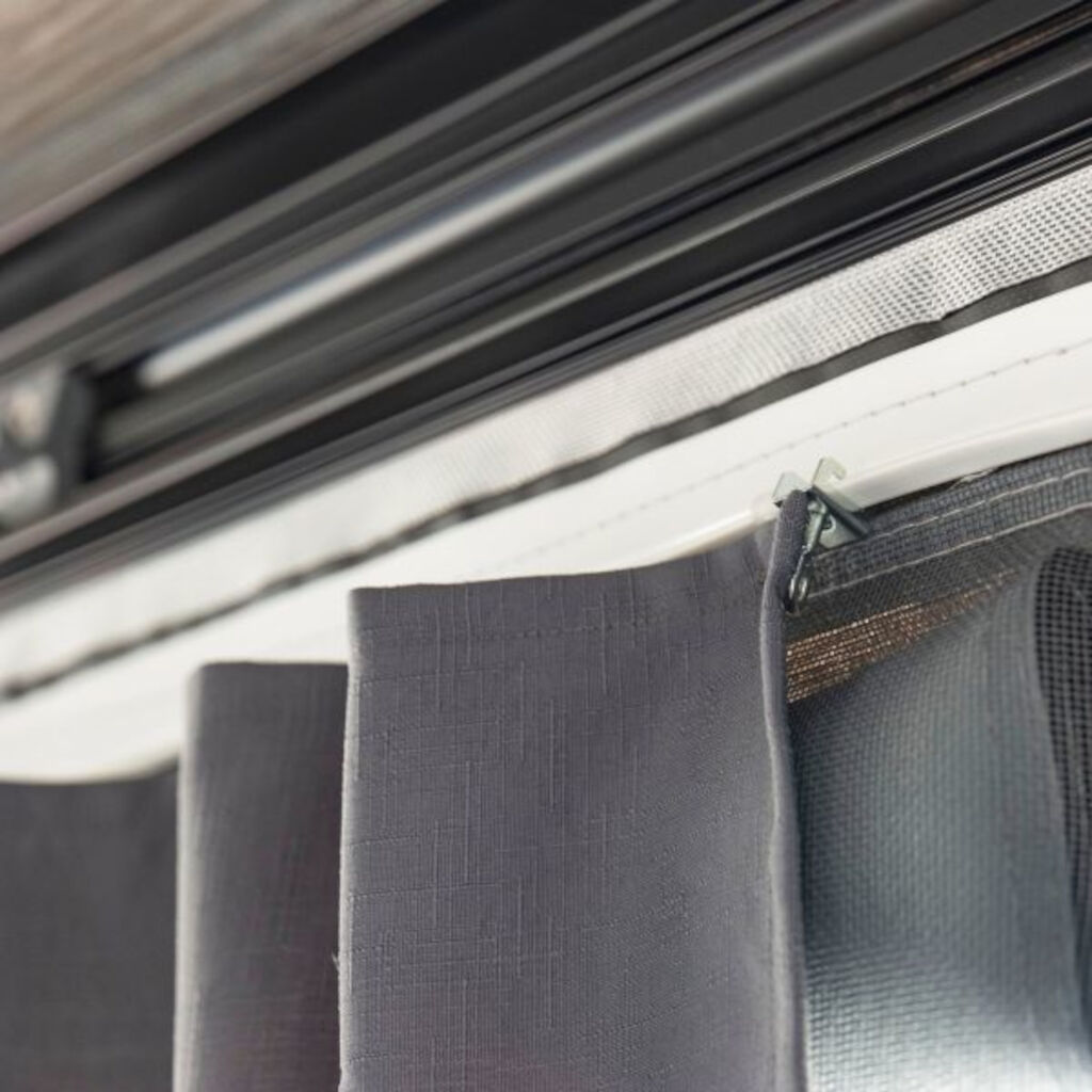 Fæstnes nemt på gardinskinnen i Fiamma Privacy Room (Zip-telt) samt i frontpaneler i Blocker Pro serien. OBS: Passer ikke på sidepaneler i Blocker Pro.