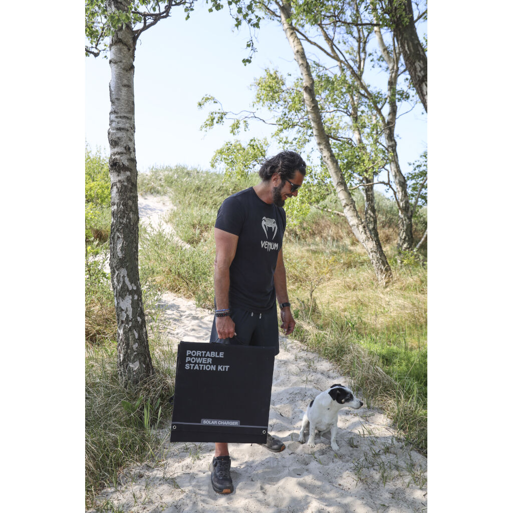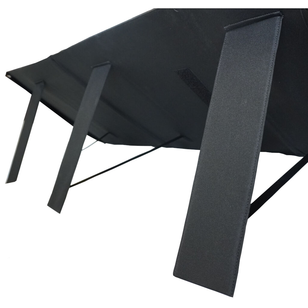 Holdbart stort solpanel, der giver en effektiv opladning af dit kraftværk. Solcelleteknologi, der giver god opladning selv i dårligt vejr (12-25W ved overskyet). Regntæt taske med lynlås, der også fungerer som stativ for både god beskyttelse og nem håndtering. Holdbart panel og vandtætte kontakter gør, at panelet kan skille sig ud i regnen.