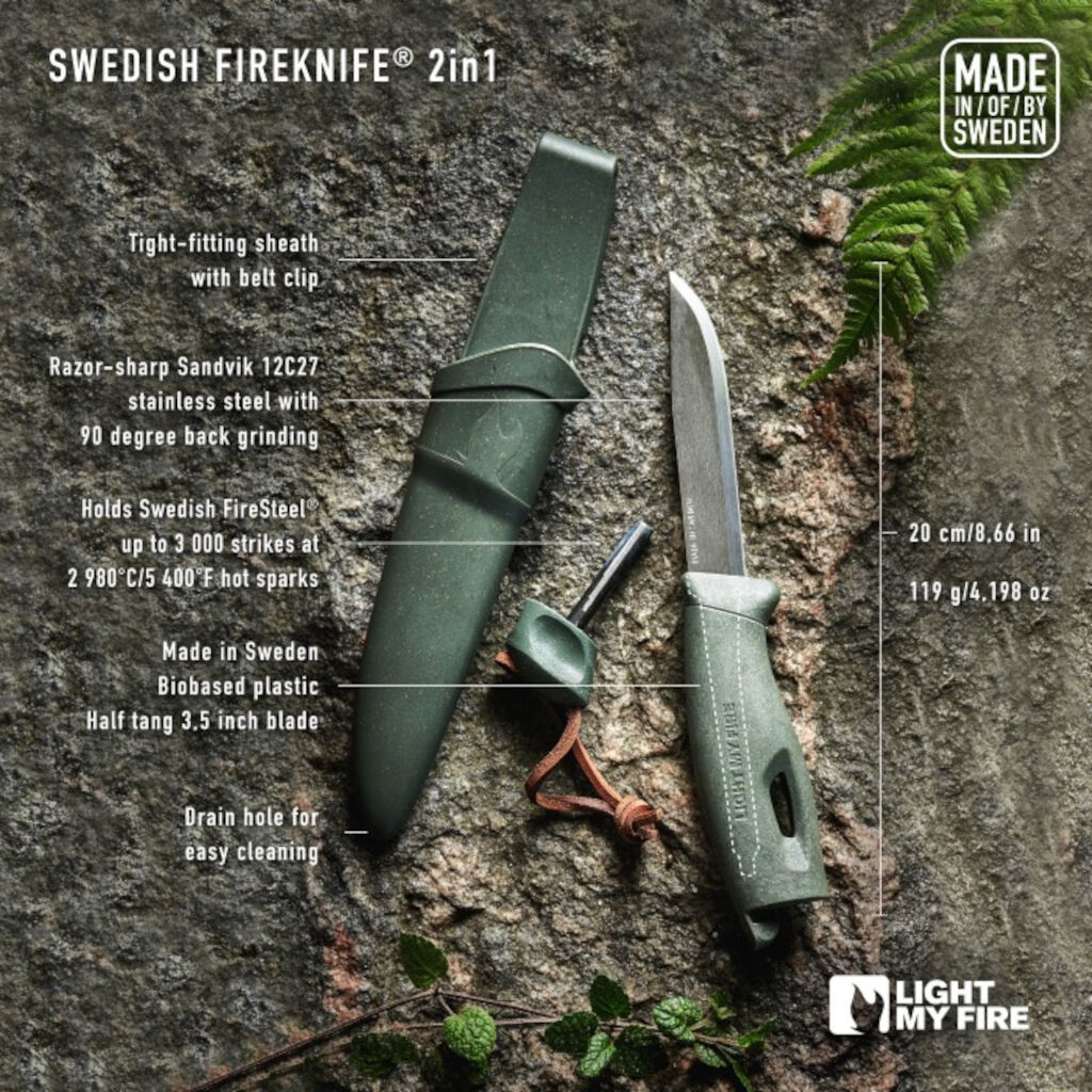 Light My Fire FireKnife er en allroundkniv, der passer til alle former for udendørsaktiviteter, fra fisketure til at tænde bål under campingturen. Kniven er fremstillet i Sverige, hvor håndtaget er lavet af bioplast baseret på kokosfiber, og det højtydende blad er lavet af 90% genanvendt rustfrit stål fra Sandvik. Ud over at være en skarp og ergonomisk kniv har den også et tændstål indbygget i håndtaget. Tændstålet fungerer i al slags vejr, uanset højde, og kan tænde både bål og campingkomfurer. Tændstålet producerer fremragende gnister, hvilket gør det lettere at tænde bål sammenlignet med mange andre mærker på markedet.