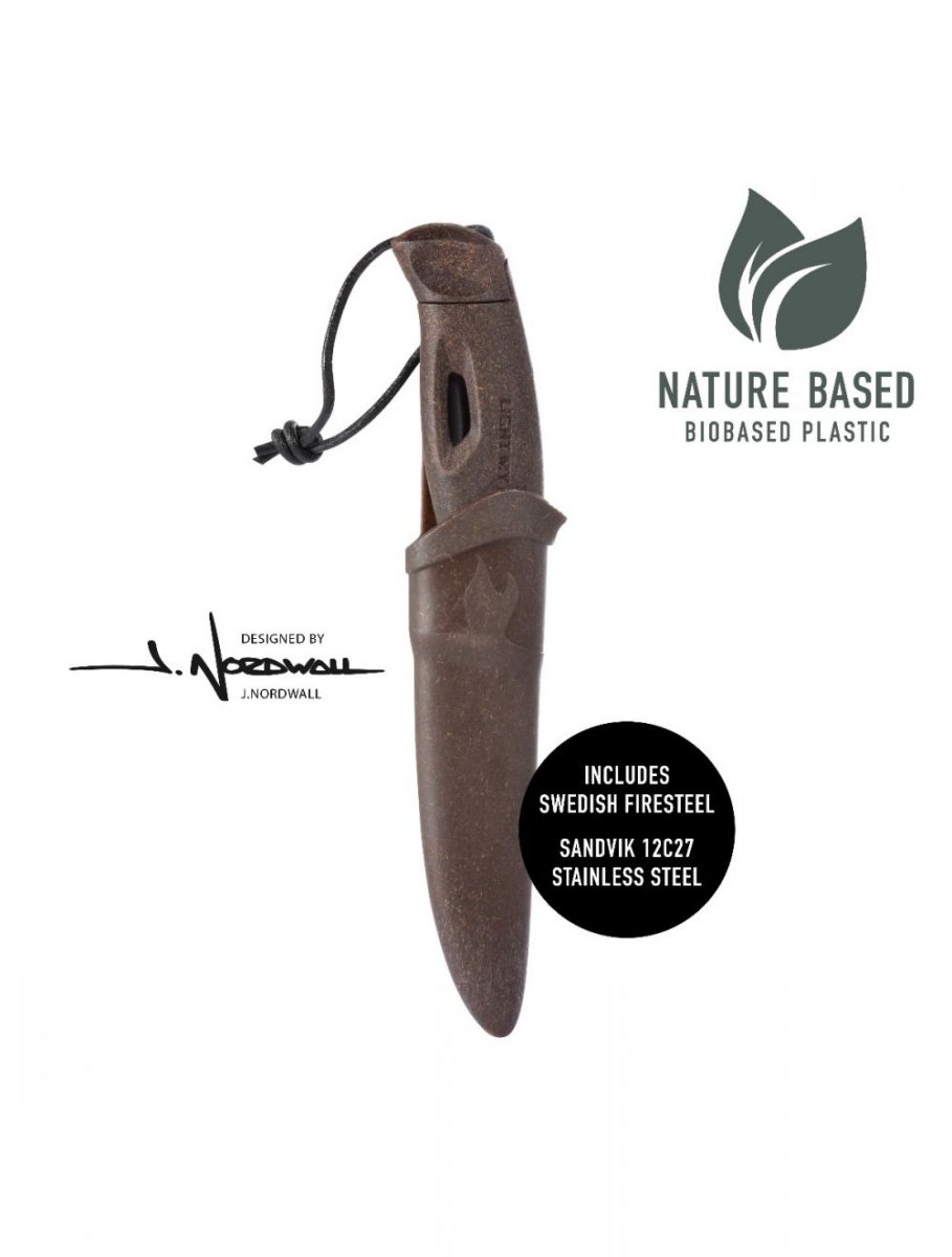 Svensktillverkad allroundkniv i bioplast med bra grepp och eldstål i handtaget.