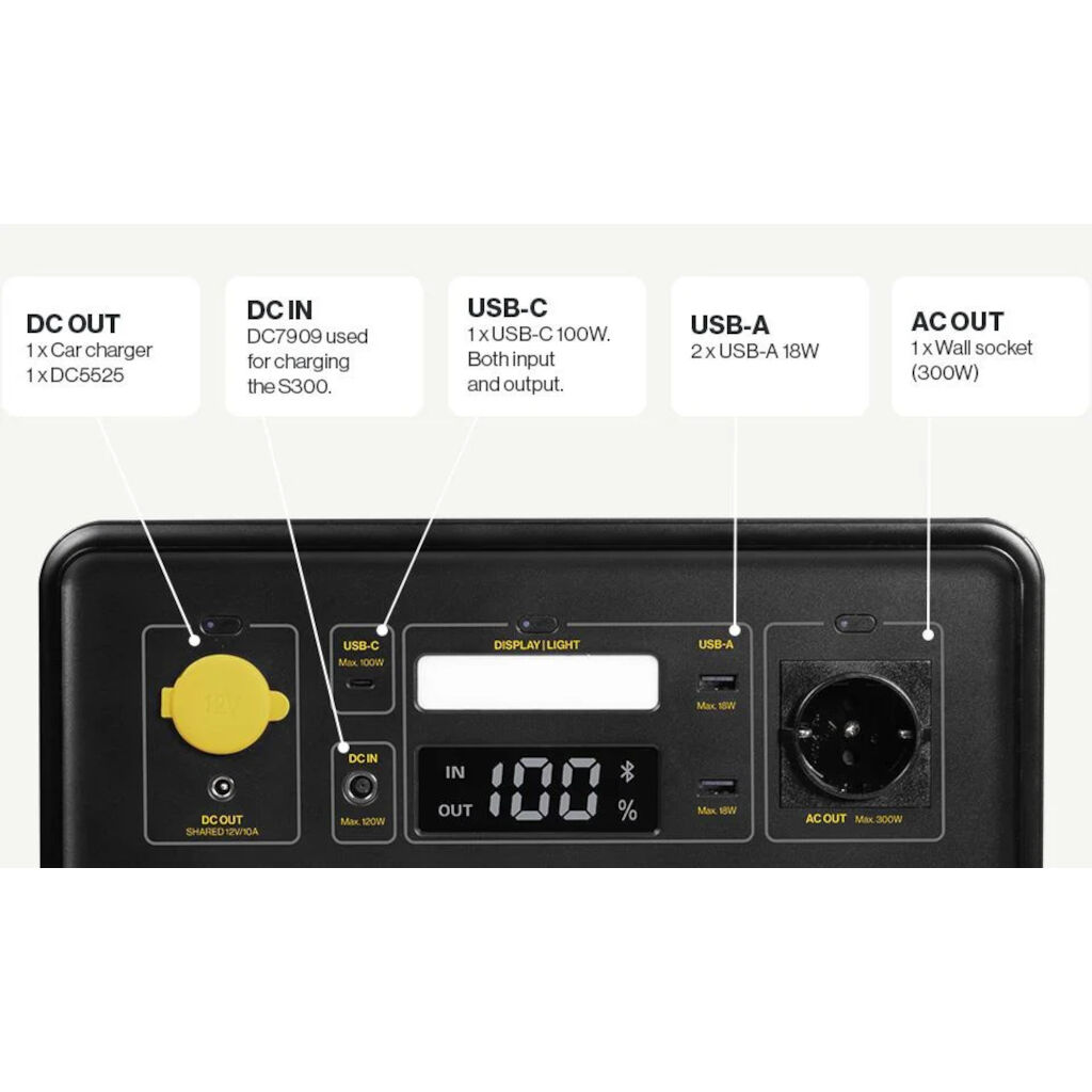 | Tilslutning | Ud: 1 x 230V (300W kontinuerlig, 500W startstrøm) 2 x USB (18W) 1 x USB-C (100W) 1 x 12V biludtag (maks 100W) Ind:1 x XT60 Solpanel 1 x Bilopladning 1 x USB-C |