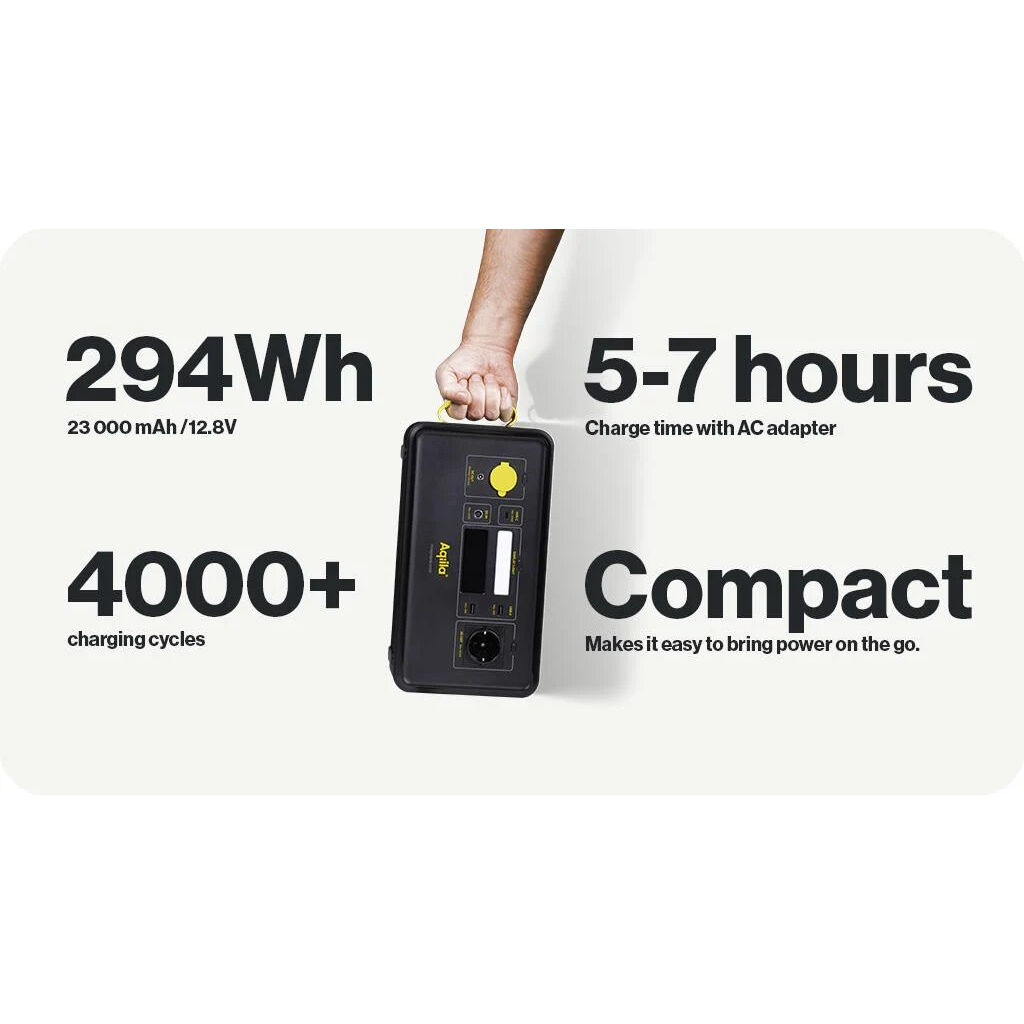 - 300W kontinuerlig effekt (500W spidser/start effekt) og en kapacitet på 294 Wh
