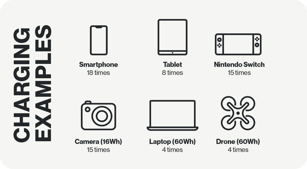 - Oplad eller brug elektronik via almindelig stikkontakt, USB-C, USB, 12V (kabel til solpanel medfølger ikke, fås som tilbehør)