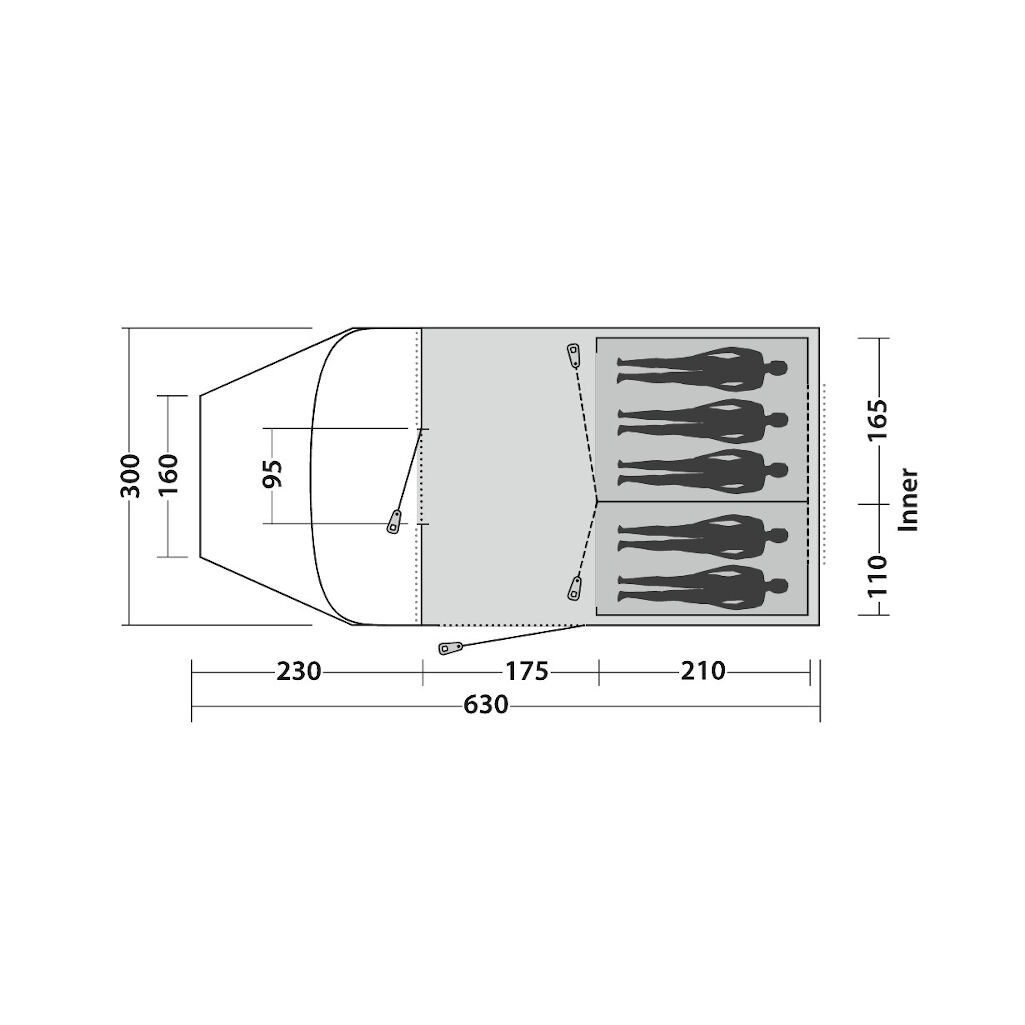 Sovekabinen er opdelt i to soverum med plads til tre i det ene og to i det andet, men teltet kan med fordel bruges af familier med et eller to børn, da lidt ekstra plads i sovekabinen gør det mere anvendeligt og giver mere plads til oppakning. Sovekabinerne er delt af en væg, der let kan fjernes, hvis du vil samle hele familien i en stor sovekabine. Et mørkt stof i sovekabinen giver mindre lysindfald og mindsker effekten af morgensolen.