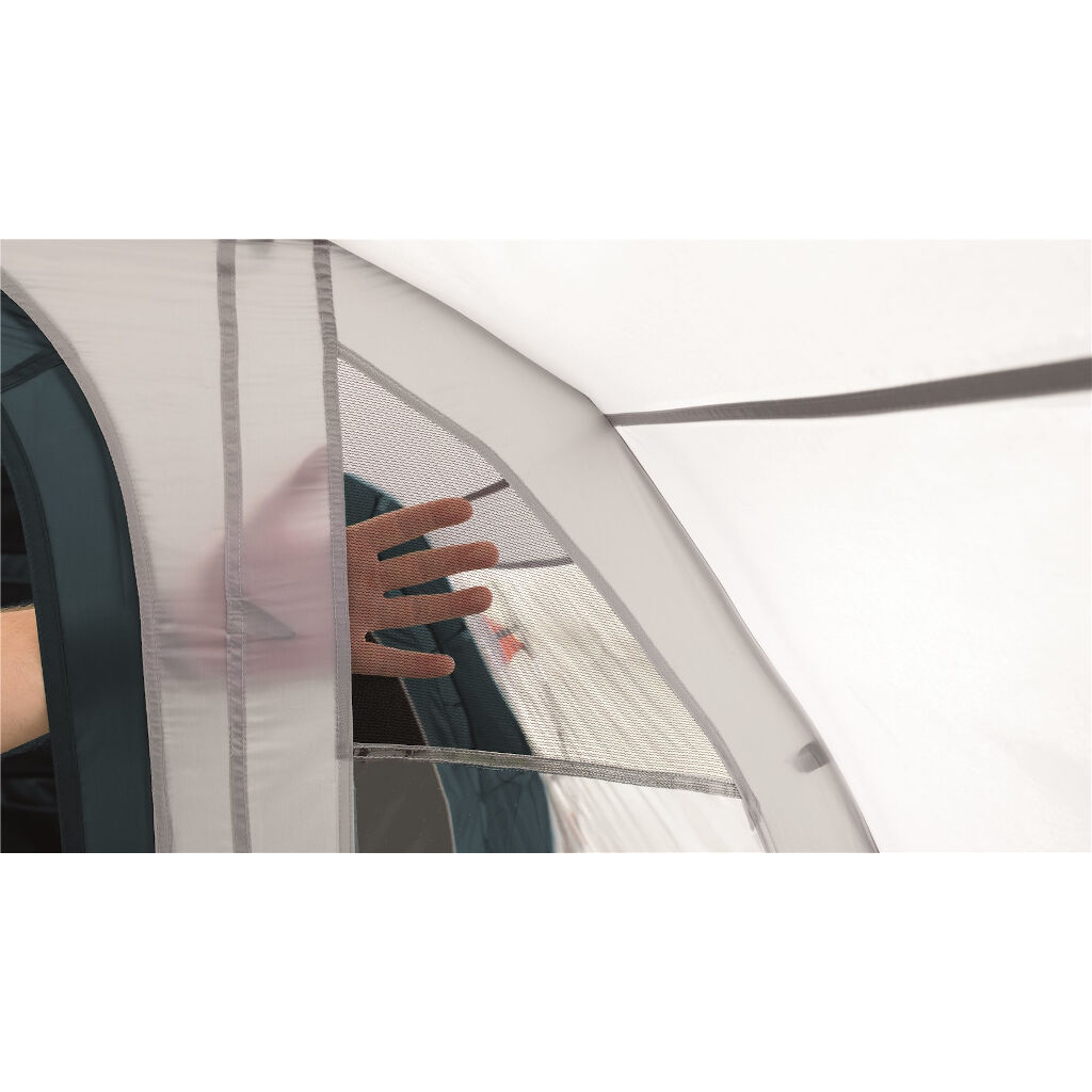 Familieteltets ventilation reguleres med en stor justerbar ventil bag sovekabinen og to justerbare ventiler foran samt via sideåbningen, takket være det integrerede myggenet i indgangen, og det kan øge luftgennemstrømningen i teltet. Den forreste indgang kan også åbnes helt for at skabe ekstra luftgennemstrømning. Solbeskyttelsen foran giver god beskyttelse mod regn og vind ved indgangen, gør det nemmere at lave mad i dårligt vejr og giver lidt ekstra skygge på de varme dage. Området kan sågar bruges til opbevaring af sko, legetøj eller udstyr.