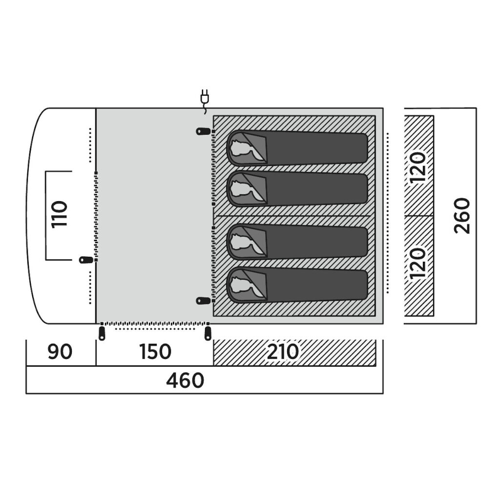 Teltets ventilation er godt designet med en stor justerbar ventil bag sovekabinen, to justerbare ventiler foran samt en sideindgang med en indbygget myggenetdør, der kan bruges til at øge luftgennemstrømningen. Foran kan døren også åbnes helt for at skabe ekstra ventilation. Solafskærmningen foran giver god beskyttelse mod regn og vind ved indgangen, gør madlavning lettere i dårligt vejr og giver ekstra skygge på varme dage. Den kan også bruges til opbevaring af sko, legetøj eller udstyr.