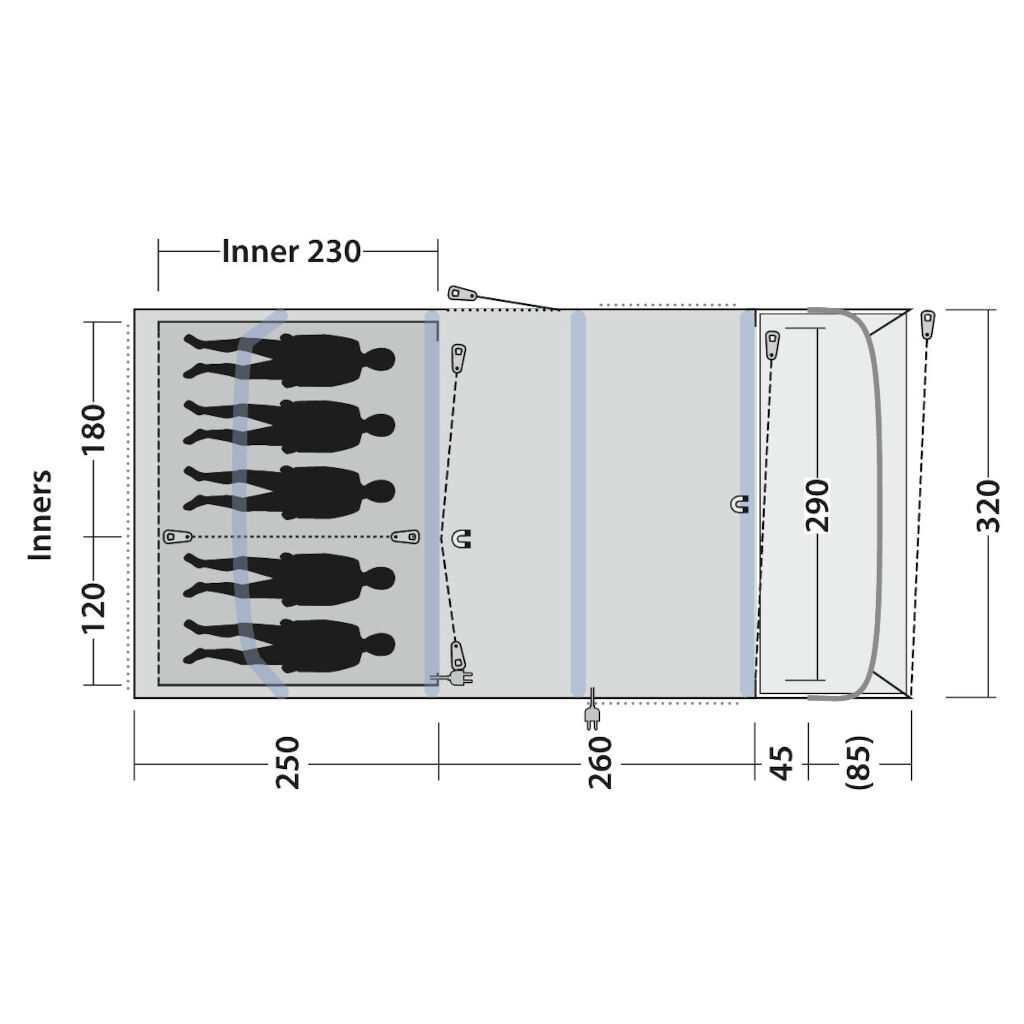 Outwell Florida 5 Air er et familietelt designet til familier eller grupper på op til fem personer, men vi anbefaler det også til familier med to børn, da den ekstra plads i soveværelserne giver mere plads til bagage og bredere senge. Det rummelige opholdsrum med store vinduer gør teltet lyst og behageligt, så uanset vejret er der plads til at spise og være sammen under ferien. Den store beskyttede frontåbning kan åbnes i to sektioner, så den kan åbnes helt på varme dage eller delvist for ventilation og samtidig give beskyttelse mod vind og indsyn. Et forseglet gulv, der er syet til yderteltet, beskytter mod vind, insekter og snavs.