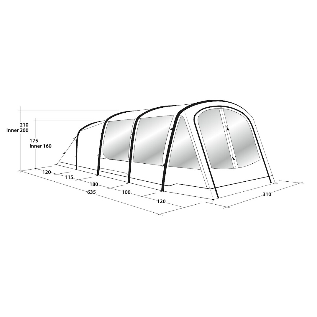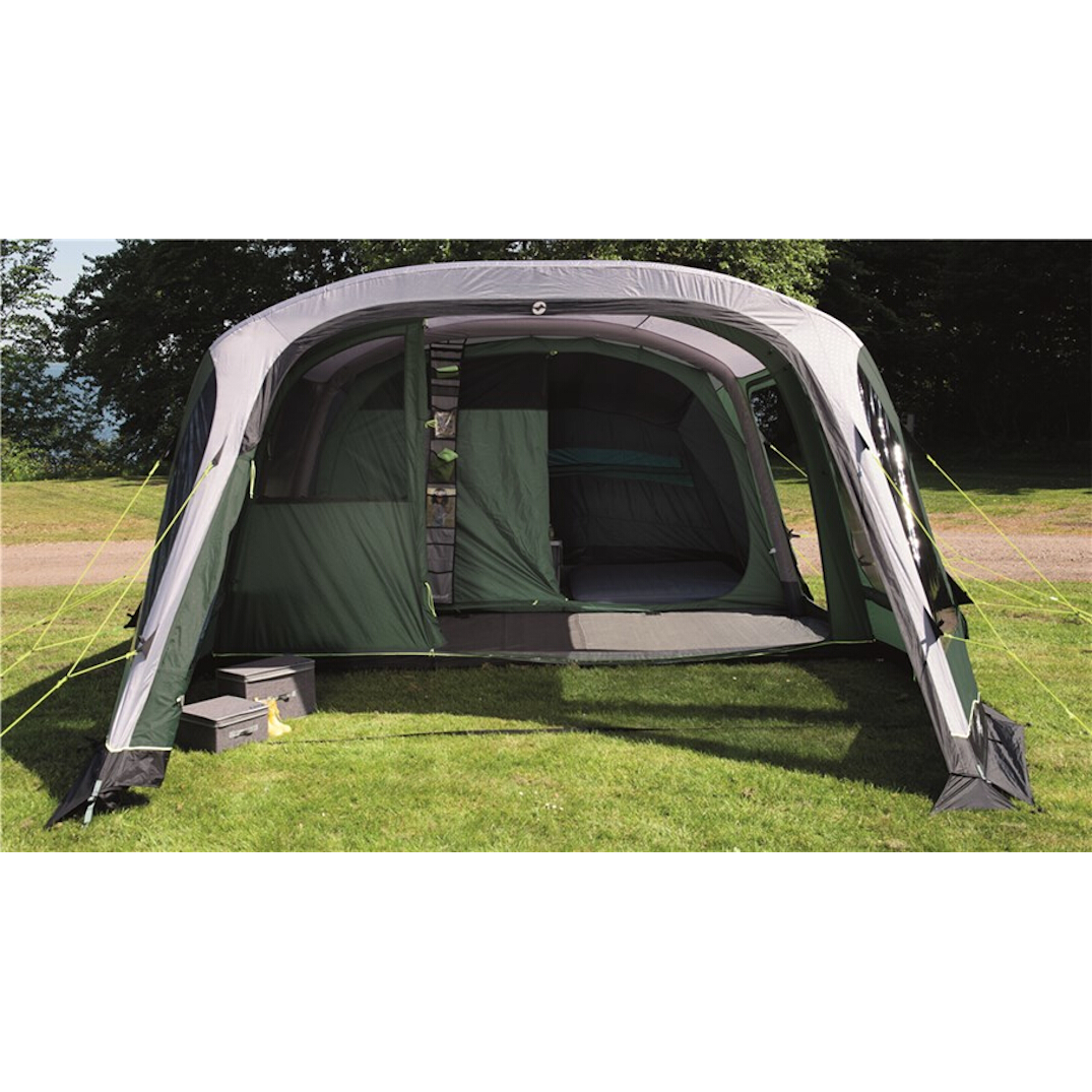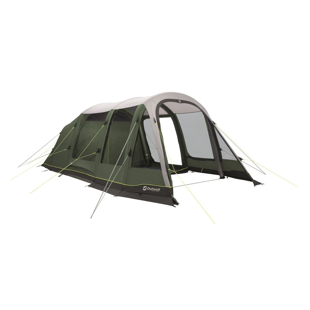 Stort og hurtigt rejst 4-personers familietelt fra Outwell, der bruger luftkanaler i stedet for almindelige stænger. To mørke soverum, et stort opholdsrum med fastsyet gulv og et ekstra rum foran giver god plads til både familien og udstyret. Rummet foran har en stor dør og kan åbnes for at få en plads i skyggen eller for at beskytte sig mod regn og vind. Rummet foran giver også plads til udstyr, som man vil holde indenfor i dårligt vejr, men ikke vil have inde i teltet.