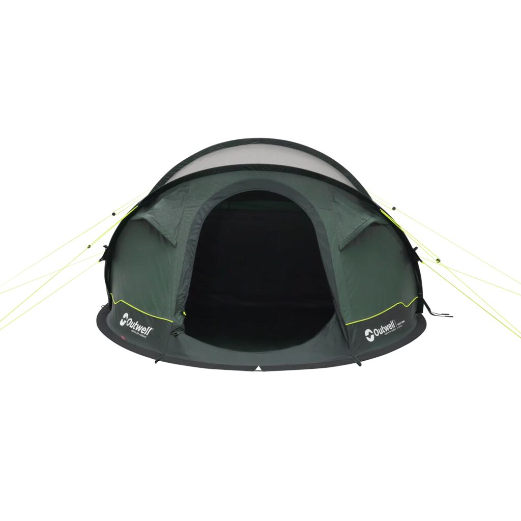 Outwell Wind Guard System, hvor dugen, stængerne og bardunerne fastgøres sammen, giver meget god stabilitet i kraftig vind. Dugen er flammehæmmende og helt vandtæt med et vandsøjletryk på 3000 mm samt tapede sømme.