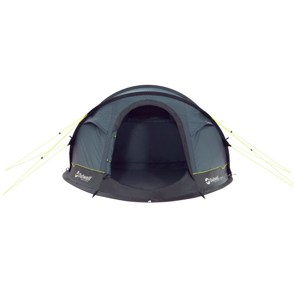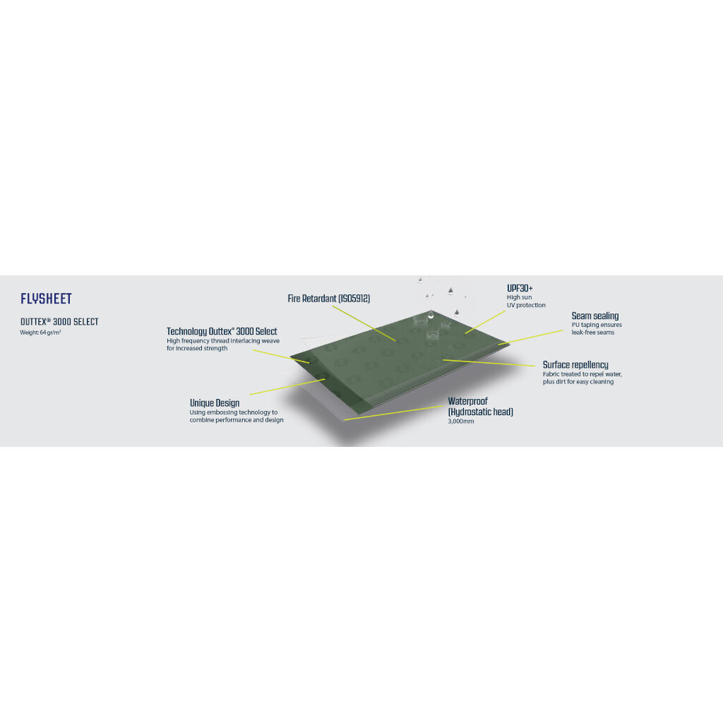 Outwell Wind Guard System, hvor dugen, stængerne og bardunerne fastgøres sammen, giver meget god stabilitet i kraftig vind. Dugen er flammehæmmende og helt vandtæt med et vandsøjletryk på 3000 mm samt tapede sømme.