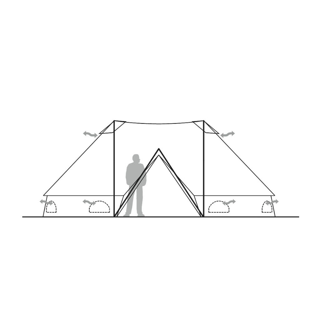 Teltets gulv kan også fjernes med en trækkæde, hvis du ønsker at bruge det uden gulv. Gulvet har også en trækkæde, der åbner det på midten for at placere et komfur eller efterlade vådt udstyr. Øverst i hver side er der justerbar ventilation og teltet har otte mindre ventilationsåbninger i underkanten. Disse kan også bruges til at bringe mere lys ind i teltet.