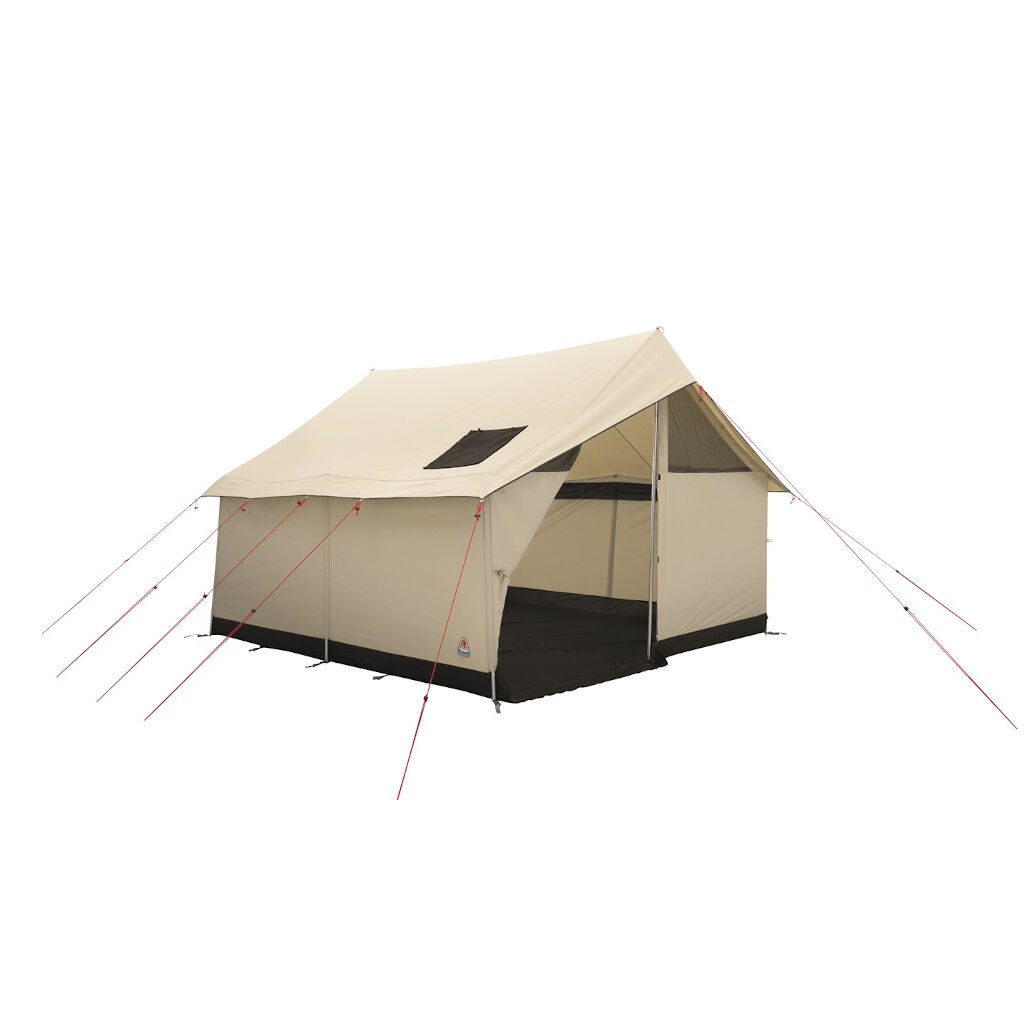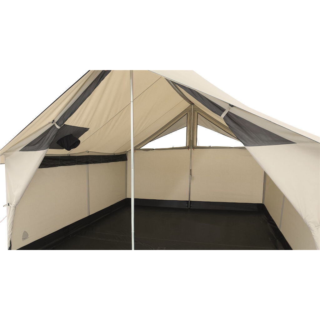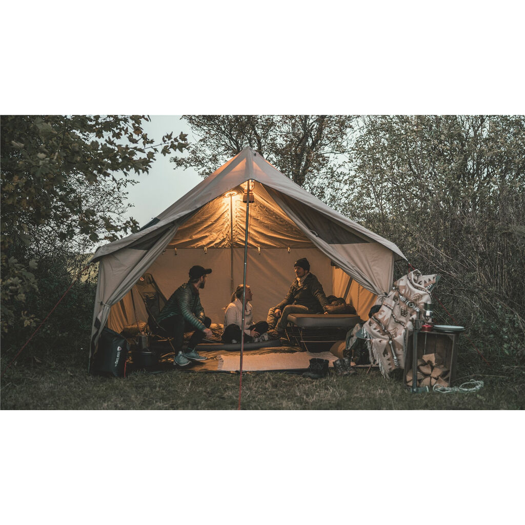 Rummeligt lejrtelt til op til 8 personer med slidstærkt stof i teknisk bomuld, solidt gulv og stabilt stålstel. Teltet kan suppleres med et indertelt til 5 personer, en teltovn og en presenning, der er monteret foran.