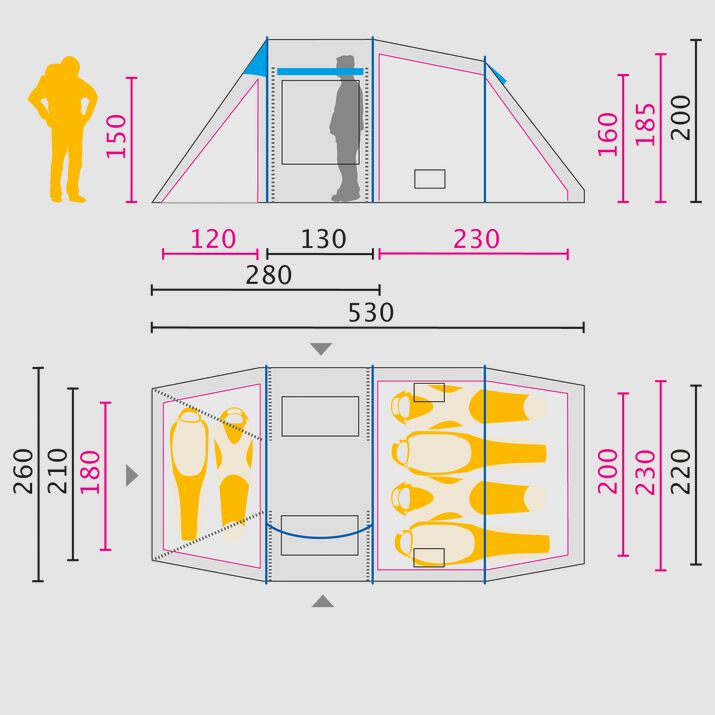 | Loftshøjde | 205 cm ydre telt og inderteltet 185 cm |