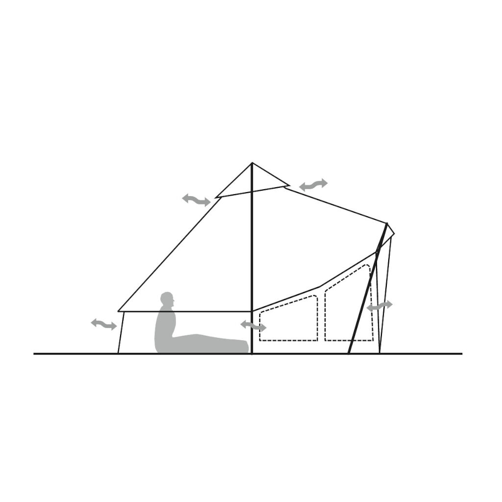 Teltets gulv har lynlås, så det kan tages af, hvis du ønsker at bruge teltet uden gulv. Gulvet har også en lynlås ind mod midten, så hvis du bruger brændeovnen, kan du åbne en sektion i gulvet, så den ikke tager skade af brændeovnen. I toppen af tipien er der justerbar ventilation og teltet har tre mindre ventilationsåbninger i underkanten. Disse kan også bruges til at få mere lys ind i teltet.