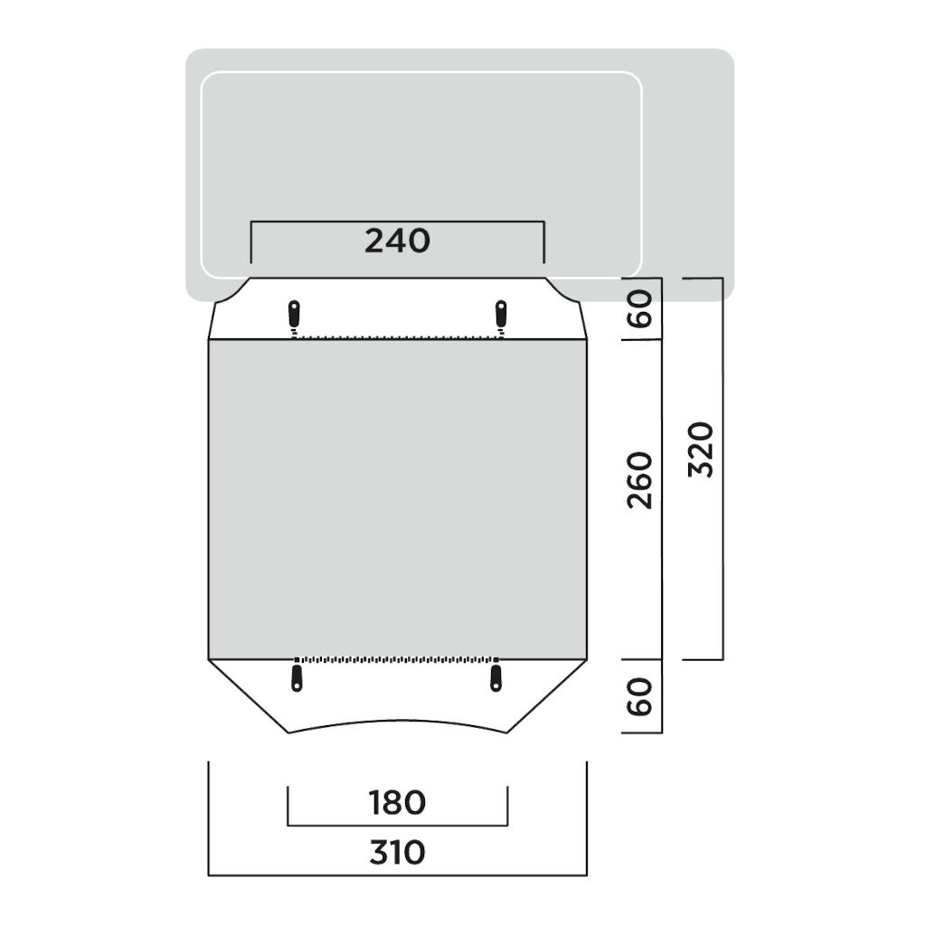 Teltdugen er fuldstændig vandtæt med tapede sømme. Slusen kan fastgøres via skinne, rails eller bardunliner over bilen. Med god ventilation, optrullige gardiner og en fastgørbar bund i badekarstil skaber dette telt et komfortabelt og beskyttet ekstra rum ved camping.