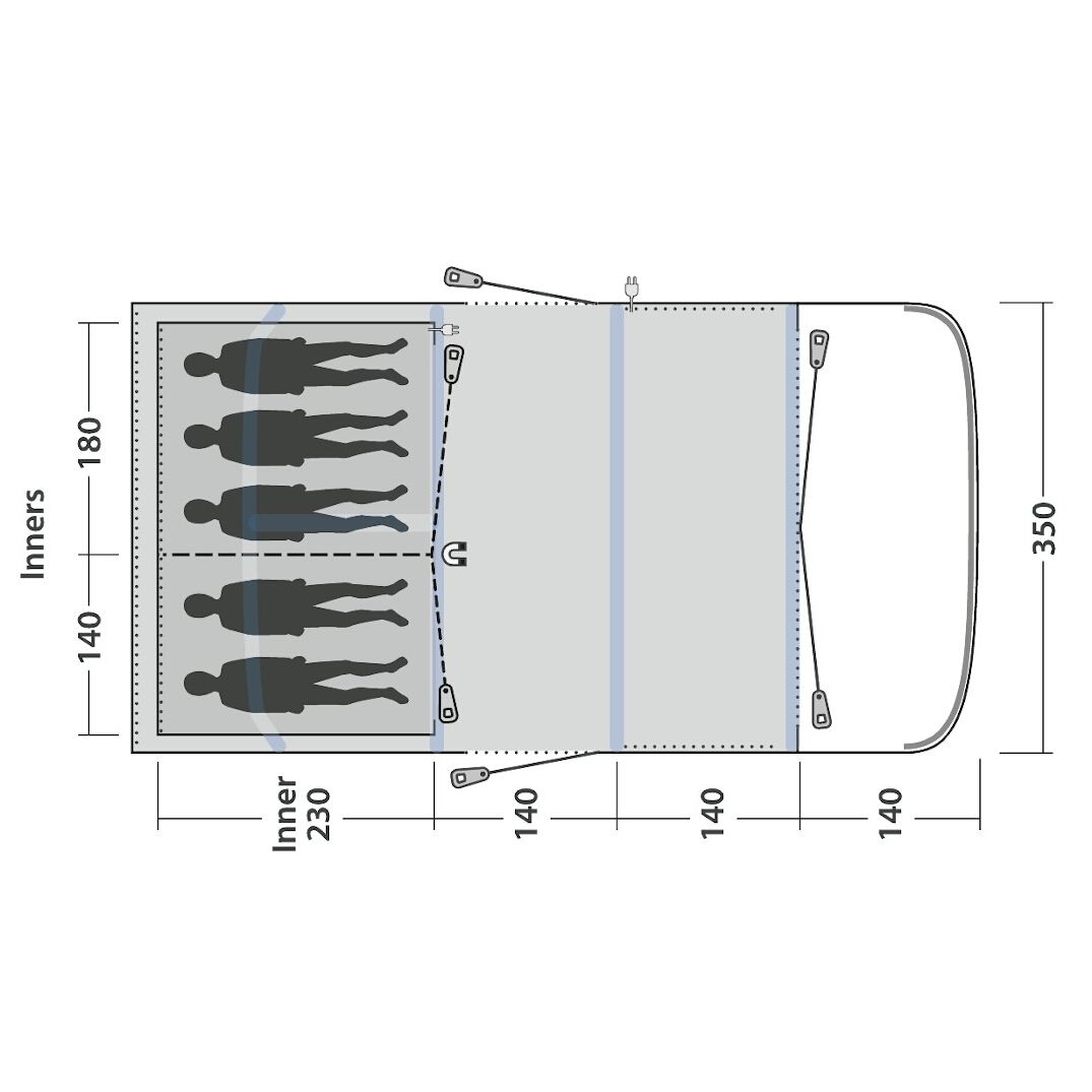 Inderteltet er opdelt i to soverum med plads til henholdsvis tre og to personer. Væggen mellem soverummene kan fjernes for at samle hele familien i et stort soverum. Da inderteltet også indeholder 35 % bomuld, har det et bedre indeklima end traditionelle familietelte, som normalt har indertelte i 100 % polyester.