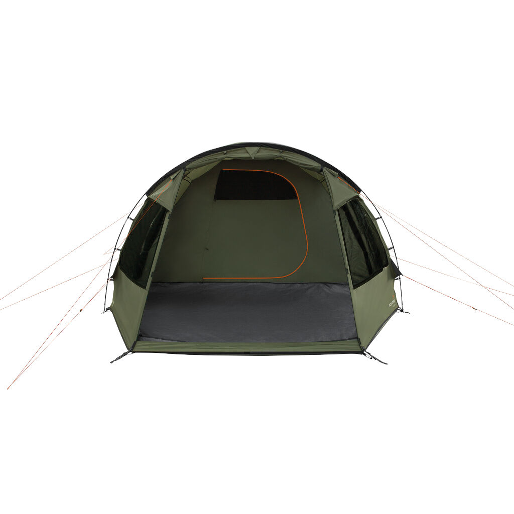 Easy Camp Kinn 5 er et stabilt kuppeltelt med et stort opholdsrum, to døre og et aftageligt gulv for fleksibilitet. Vinduer på begge sider med gardiner giver lys og privatliv, mens ventilation foran og i toppen sikrer et behageligt indeklima.