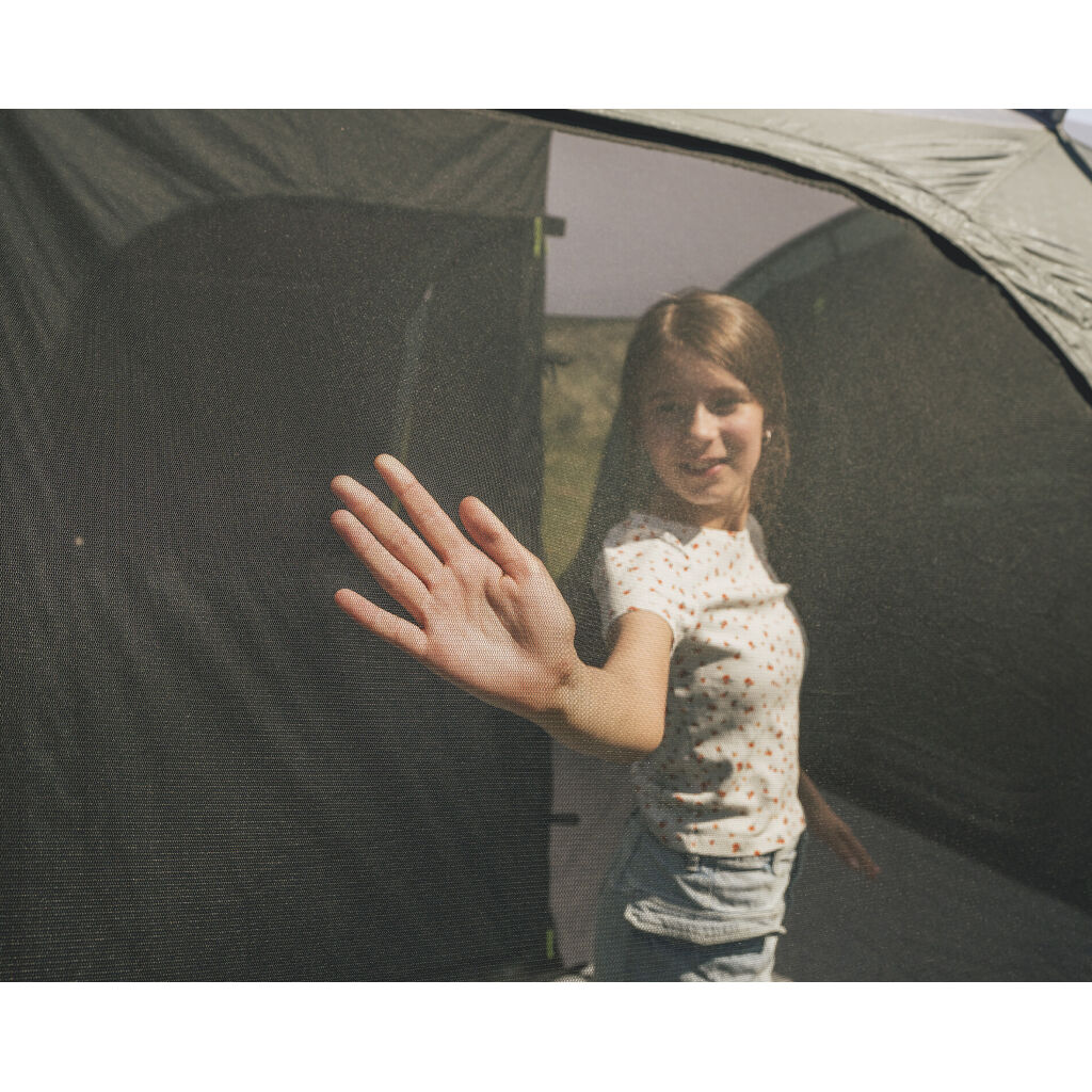 Ventilationen bagtil kan åbnes helt for at skabe ekstra luftgennemstrømning på varme dage eller om morgenen. Ventilationen foran over vinduerne er også generøst dimensioneret for at sikre god gennemluftning. Da begge åbninger er udstyret med netdøre, kan teltet åbnes helt uden at lukke insekter ind – perfekt på varme dage eller ved camping i varmere klimaer.