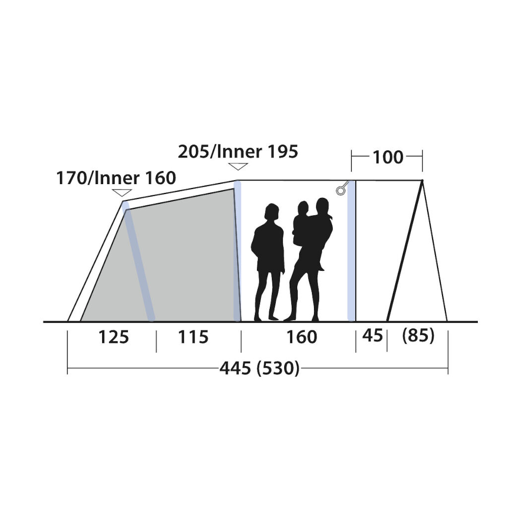 | Indertelt | Et mørkt tagpanel og mørke sider reducerer lysindtrængningen og giver en bedre søvn Åndbar, 100% polyester |