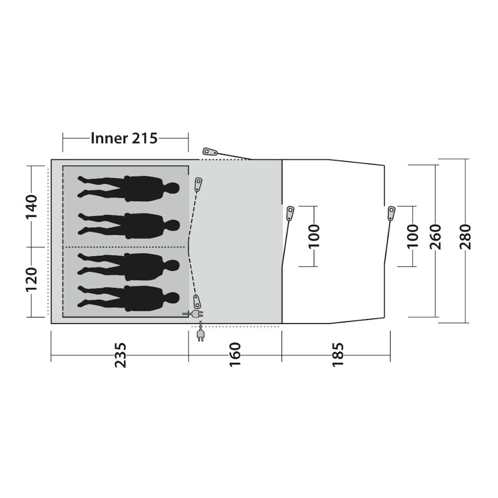 - Tre zoner giver familier vådområde, tørt opholdsrum og soveområde. Det forreste indertelt er ideelt som ekstra soveplads eller til opbevaring og kan nemt fjernes for at skabe mere plads
