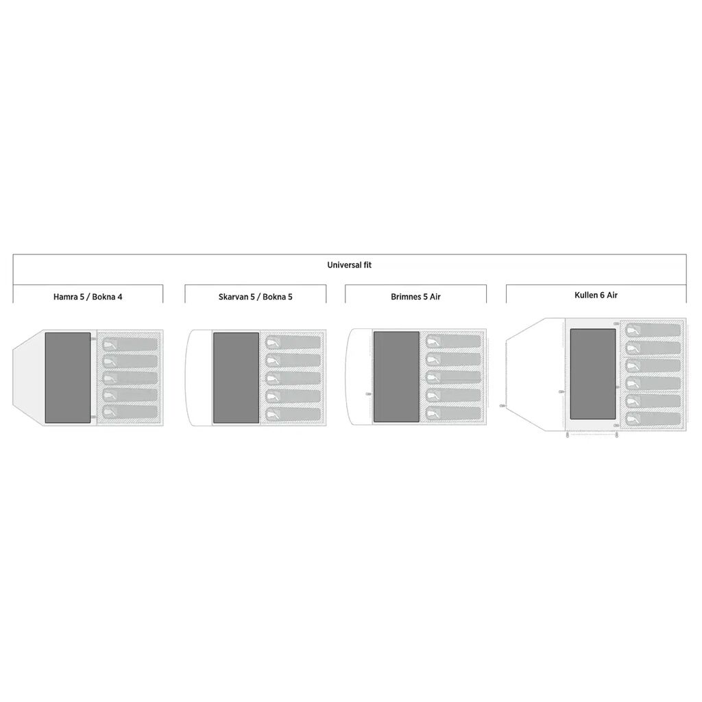 - Tilpasset teltene Hamra 5/Bokna 4, Skarvan 5/Bokna 5, Brimnes 5 Air og Kullen 6 Air