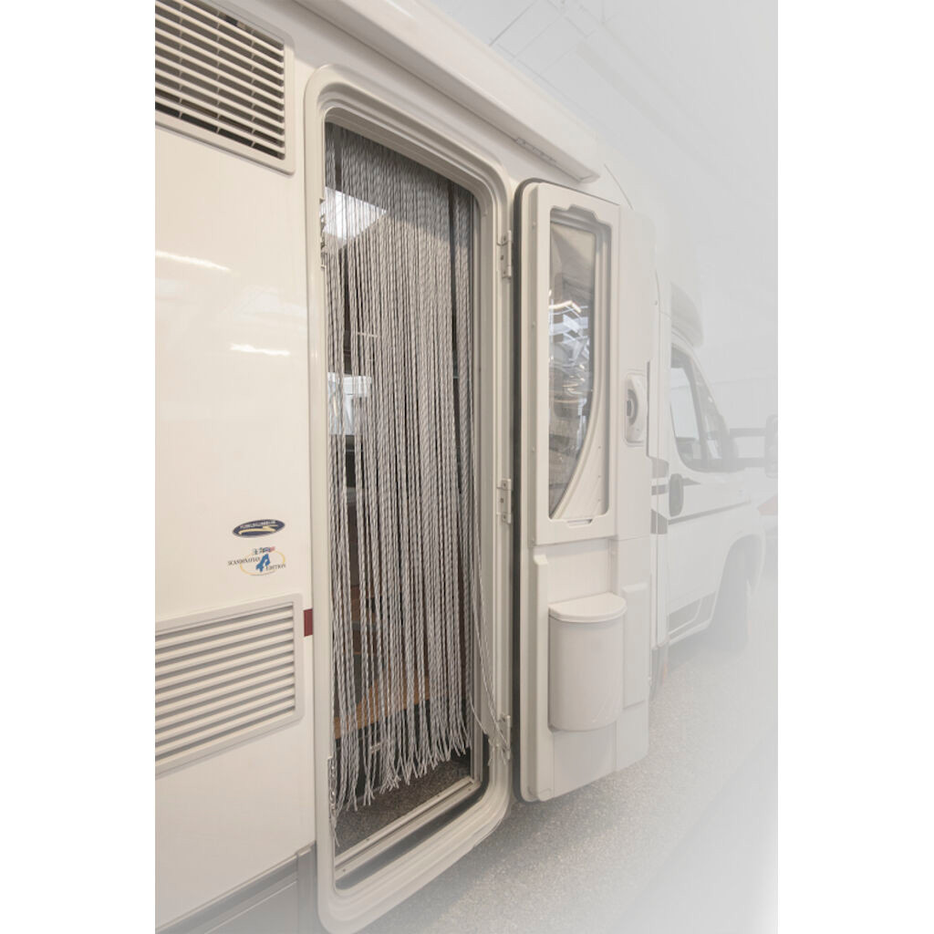 Dørgardin med flettet polyester, der effektivt forhindrer småkravl i at komme ind i campingvognen eller autocamperen.