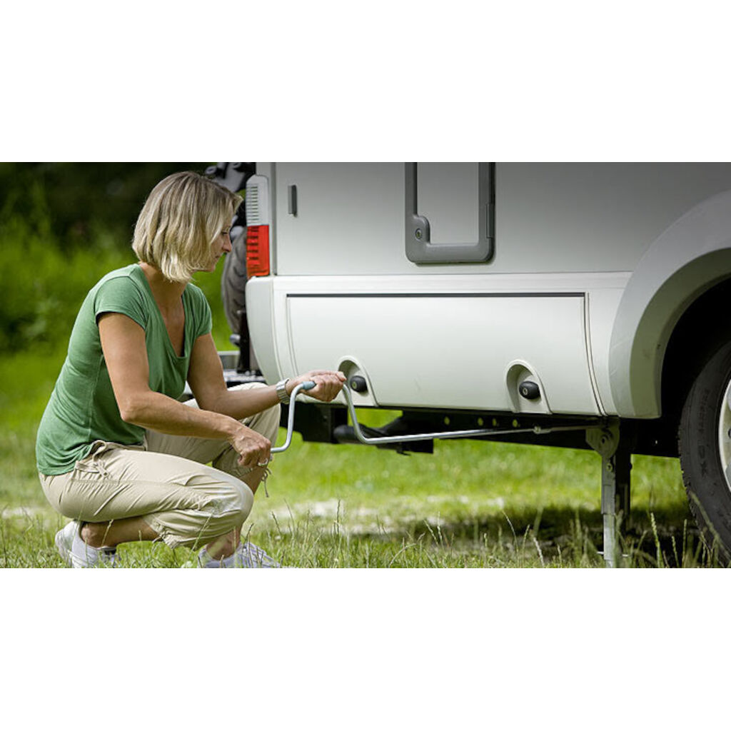 Støtteben til montering bag på autocampere med AL-KO AMC chassis. De kan også monteres på andre rammer, men dette kræver boring af huller og muligvis ekstra forstærkning. Støttebenene drejes manuelt op og ned (Bemærk: Vejl er ikke inkluderet i leveringen). I endepositionen drejer vejen opad og låser sig automatisk, så benene ikke utilsigtet folder ned under kørsel. ClickFix-støttebenene har også en integreret sikkerhedsmekanisme, der gør det muligt at køre afsted, selv hvis støttebenene er udfoldet, så skader på både støtteben og autocamper undgås.
