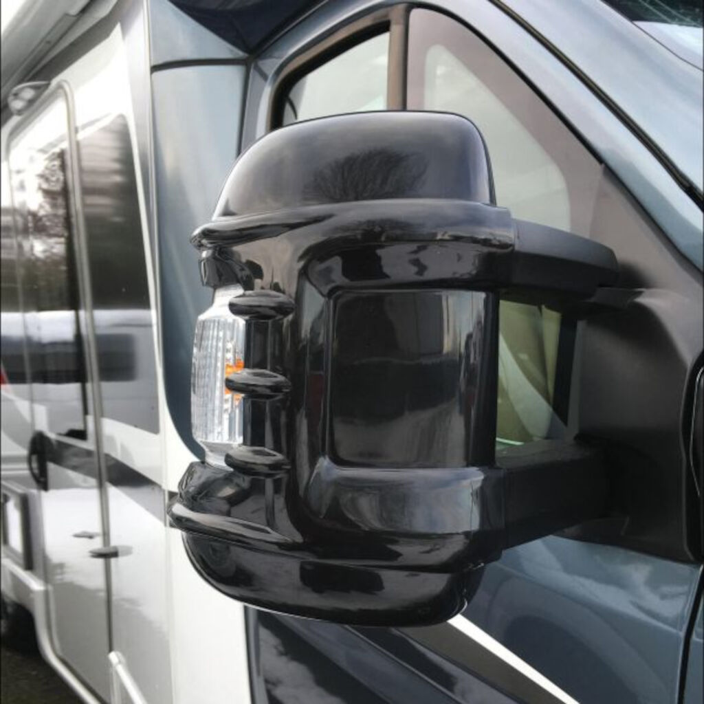 Bakspejlsbeskyttelse, der er monteret på autocamperens bakspejl. En skrue i beslaget sikrer, at det sidder rigtigt. Opfylder alle køretøjssikkerhedsstandarder. Passer til Fiat Ducato bygget siden 2007, Peugeot Boxer og Citroën Relay med bredarmede spejle.