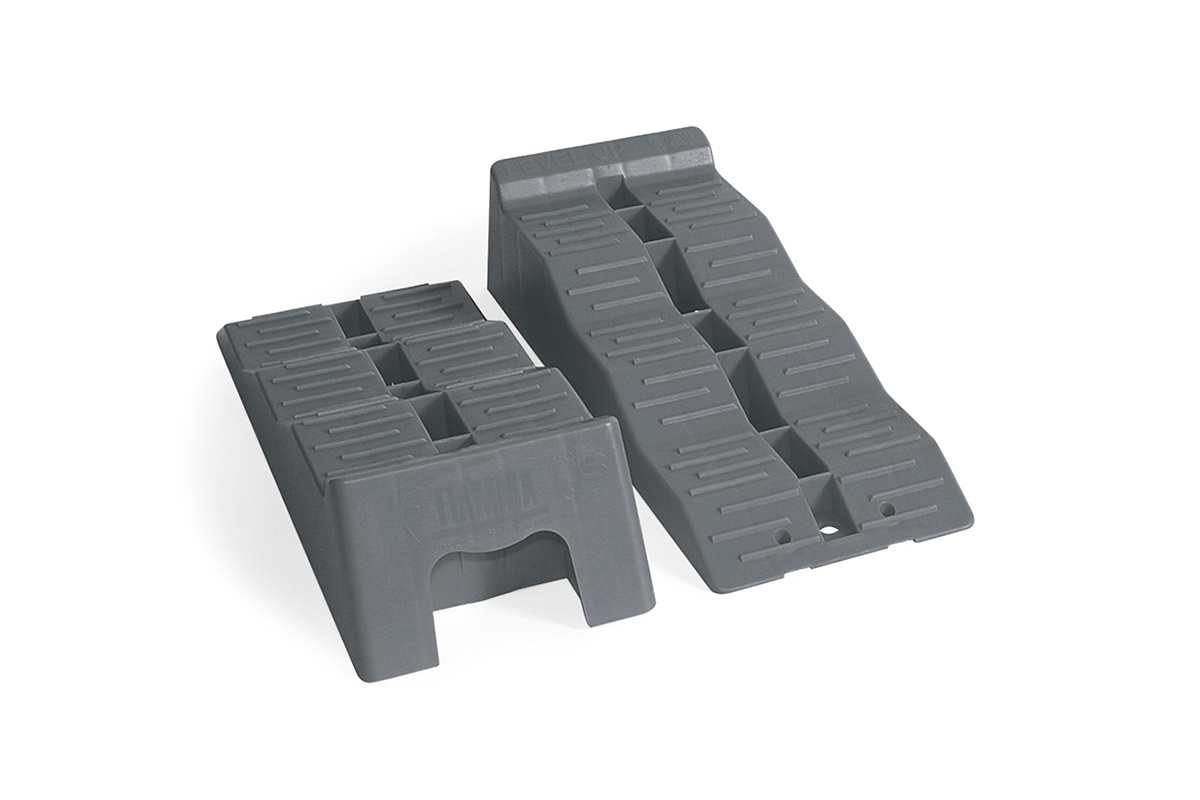 Opkørselsramper/niveaukiler fra Fiamma med tre niveauer, der kan klare en samlet belastning på 5 tons (af 2). Med en grebsvenlig overflade og tre niveauer på 4, 7 og 10 cm bliver det nemt at få din autocamper til at stå lige.