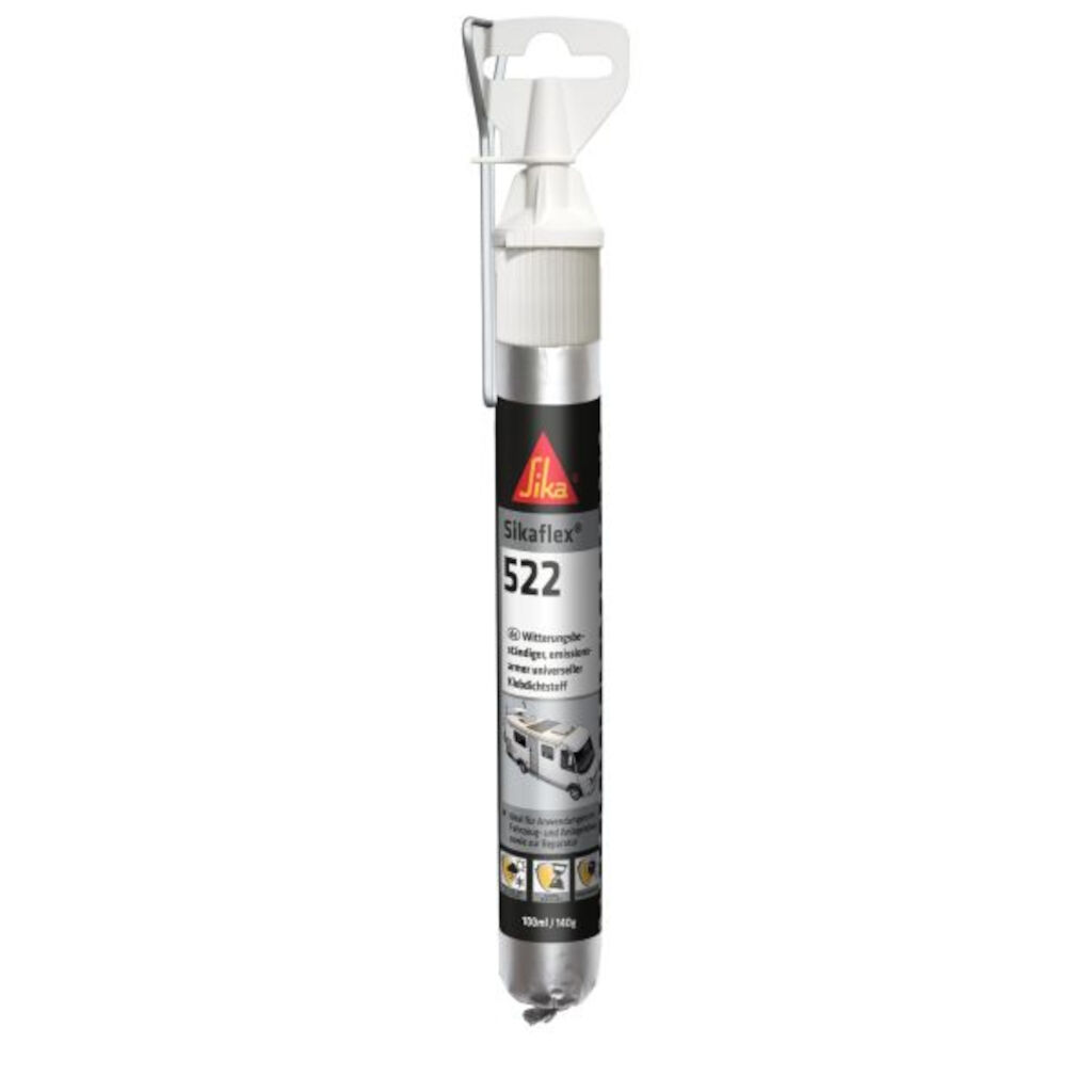 En mindre emballage af Sikaflex 522, som er perfekt til mindre arbejder eller reparationer. Sikaflex 522 er en højtydende, enkomponent polyurethanbaseret lim- og tætningsforbindelse, specielt udviklet til brug i bilindustrien, særligt for campingvogne og autocampere. Her følger en teknisk beskrivelse af produktet: