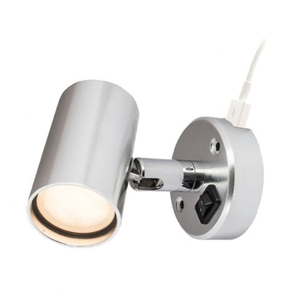 Led spotlight med kontakt og USB-stik til opladning af mobiltelefoner eller andre små håndholdte enheder. Lampen er i forkromet metal og giver et varmt hvidt lys til dit hus eller mobilhome.