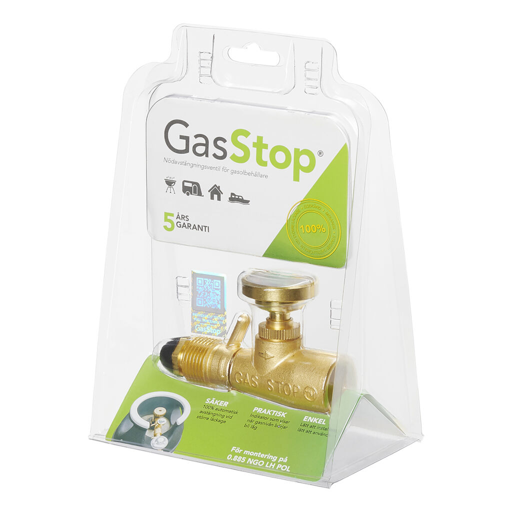 GasStop er en smart og sikker nødafbryderventil, der automatisk afbryder gastilførslen ved større gaslækager eller systemfejl. Den er 100 % mekanisk og kræver ingen strømkilde, hvilket gør den til en praktisk sikkerhedsløsning til både hjemmet og fritidsbrug. Udover at fungere som nødafbryder har GasStop en indbygget gasniveaumåler, der viser, når gassen er ved at løbe tør, så du kan planlægge genopfyldning i god tid. Ventilen kan også bruges til at teste mindre lækager i systemet. Nem at installere med blot få enkle trin.