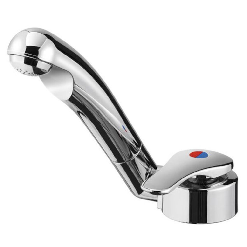 Køkkenblander til campingvogne og autocampere fra tyske Reich med en lang tud, der kun bygger 40 mm, hvilket gør den velegnet til vaske med låg. En keramisk indsats sikrer lang levetid og kan nemt udskiftes, hvis der opstår problemer med tætningen.