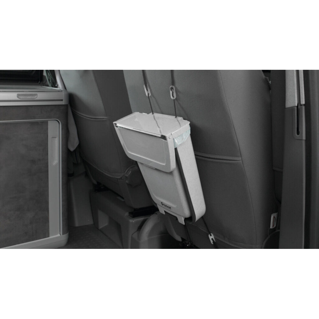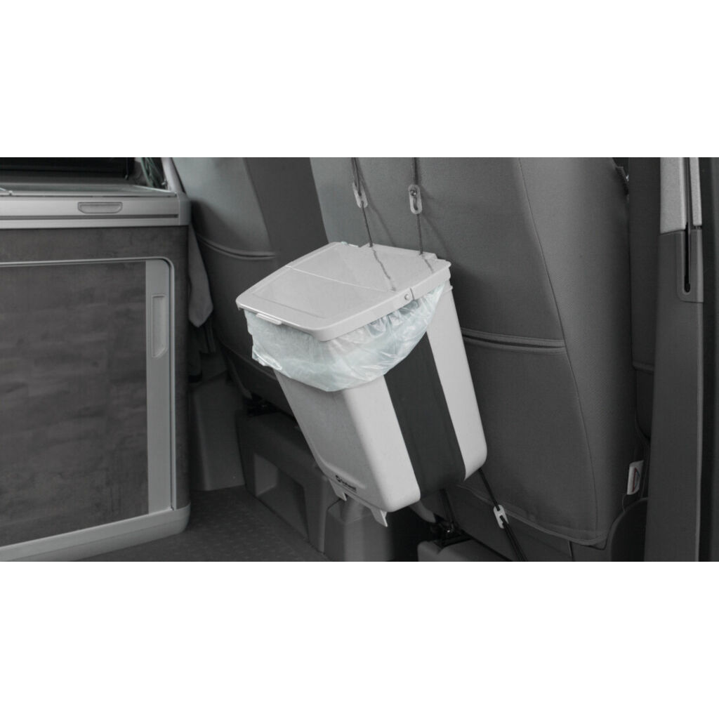 Praktisk og sammenklappelig affaldsspand på 9 L som enten kan fastgøres til dæk, ryglæn osv. takket være de medfølgende monteringsstropper og kroge.